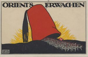 (Almanya’da dağıtılan savaş propaganda kartpostalında “Doğunun uyanışı” üst yazısıyla bir fesin içinden çıkan Osmanlı ordusunun Alman emperyalizminin çıkarları doğrultusunda sürüklendiği 1.Dünya Savaşı’ndaki destekçi rolü övülüyor)