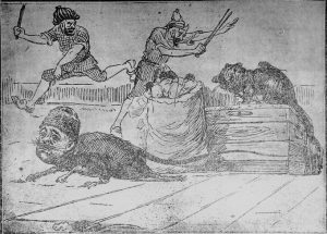 (1.Dünya Savaşı Yıllarında önemli bir mizah ve muhalefet odağı olan Karagöz dergisinden bir karikatür. Karikatürde, levazım depolarını soyan Osmanlı militeri fare olarak betimlenmiştir. Karikatürde savaş vurgunculuğu eleştirilir.)